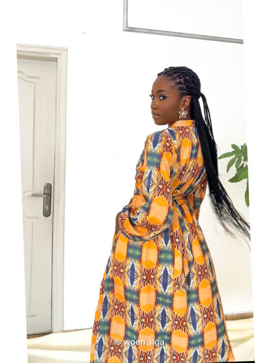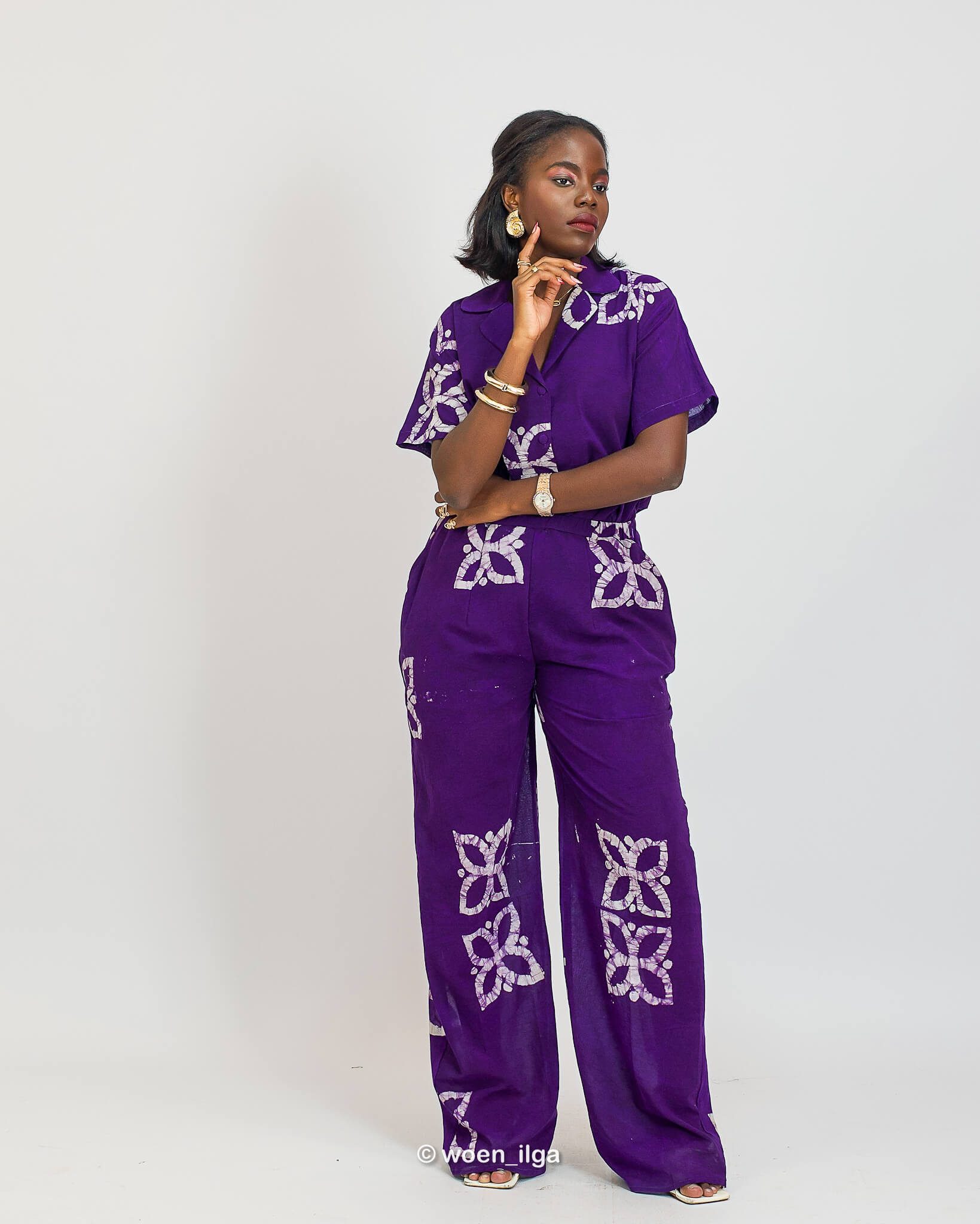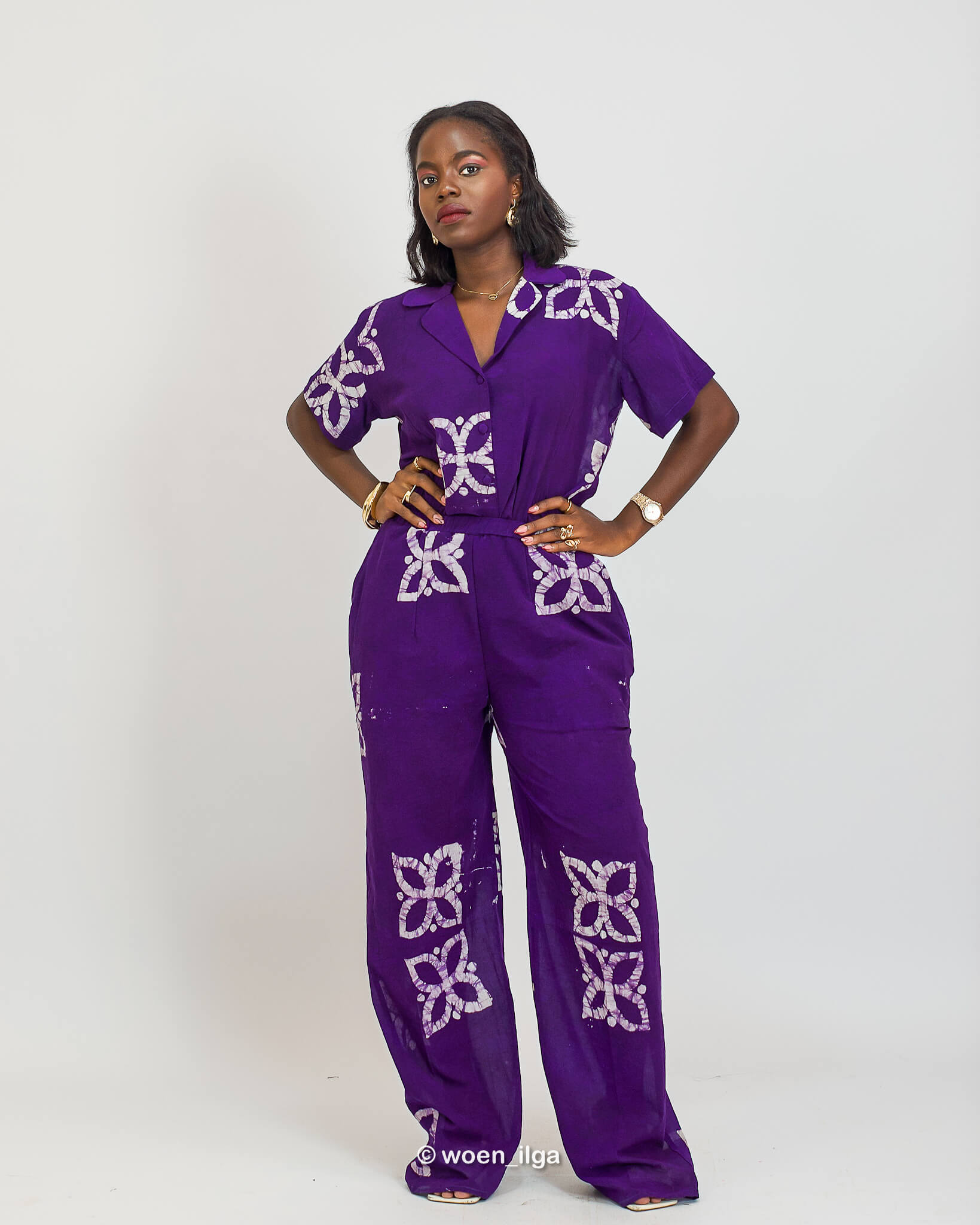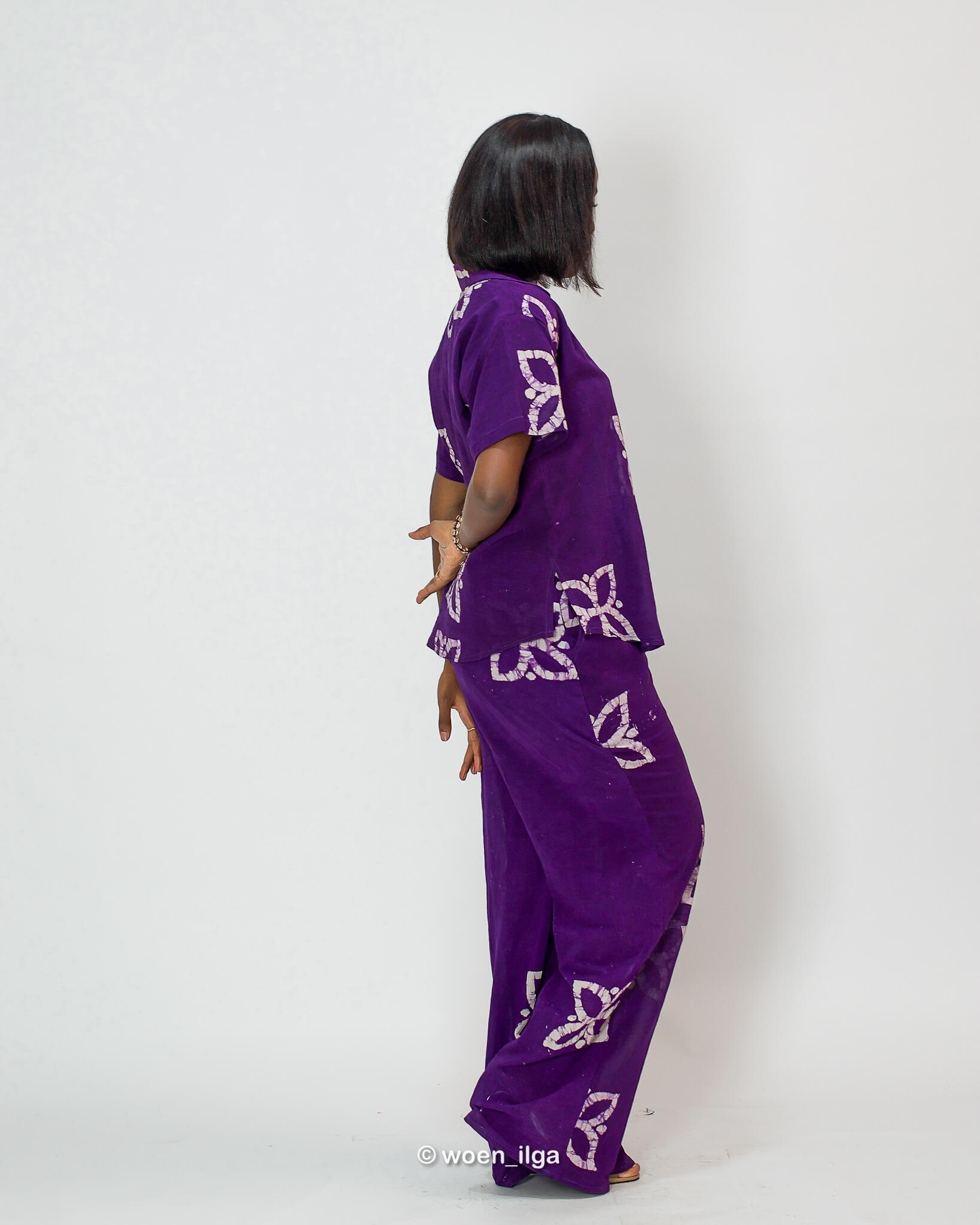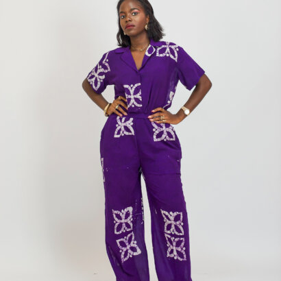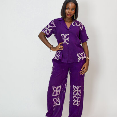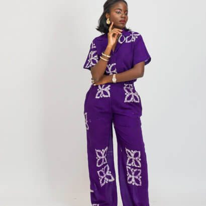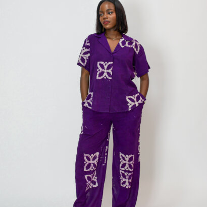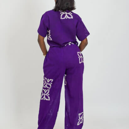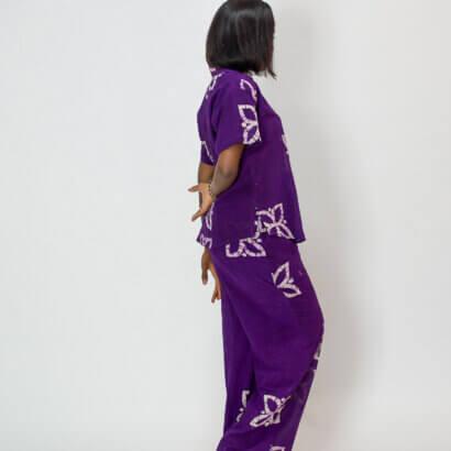 L’ensemble NORA, est composé d’un haut manche courte et d’un pantalon en tissu coton léger fait main au Bénin.