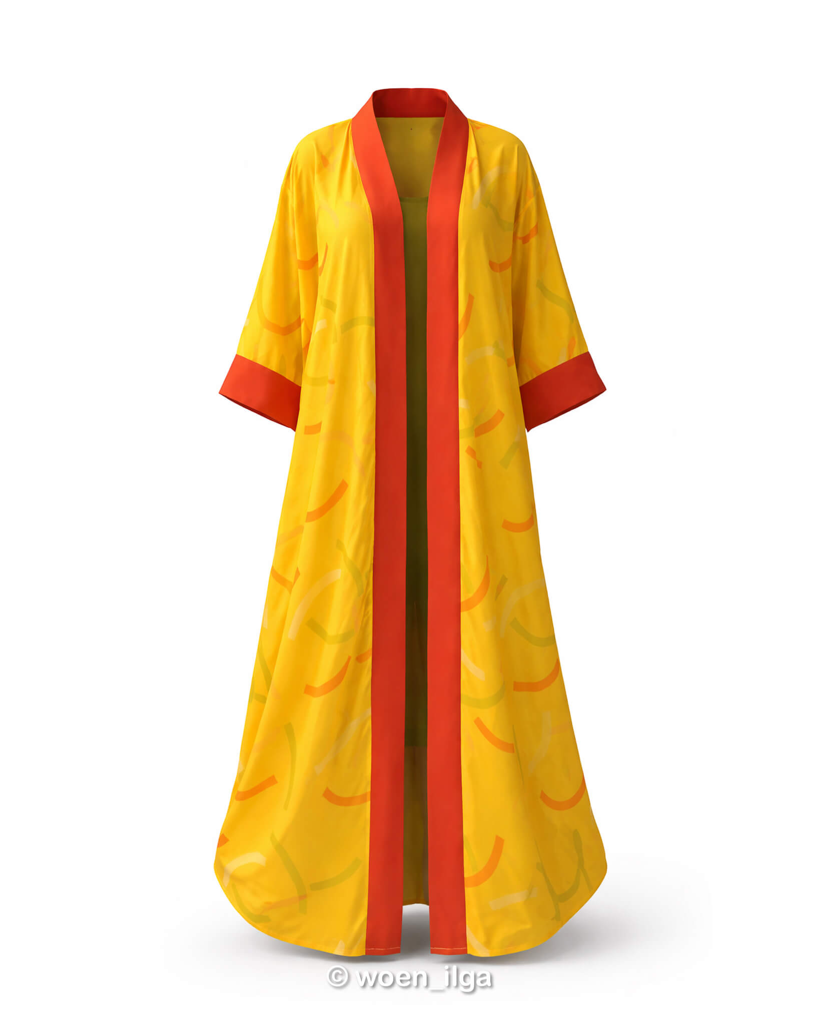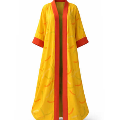 Le kimono est un paréo pour femme, à manches légères garni d’une bande et de deux agrafes devant . Il est fait en tissu mousseline.
